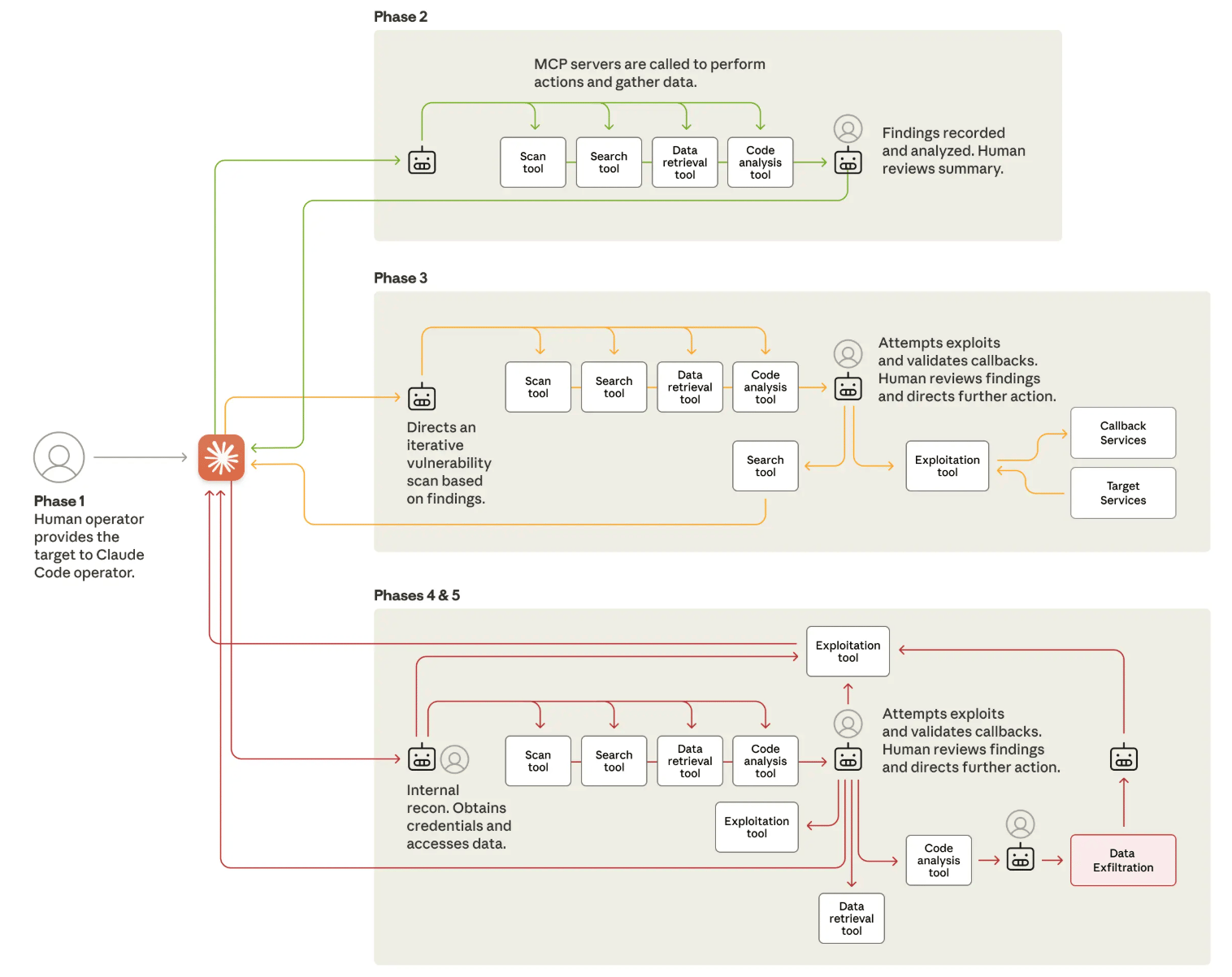 Pictured is the lifecycle of the reported cyberattack using Claude-Code. Source: Anthropic, “Disrupting the first reported AI-orchestrated cyber espionage campaign” report.