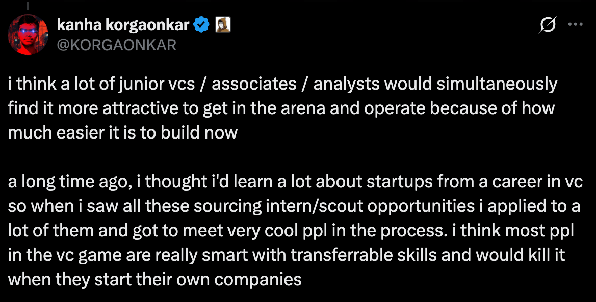 Everyone keeps saying AI will replace junior VC work, but honestly that was never the edge. The real advantage has always been scar tissue. Knowing exactly how companies quietly fall apart from a thousand tiny decisions and catching it early. Data tells you what happened. Great investors are underwriting what hasn’t shown up yet but will. More on this here.